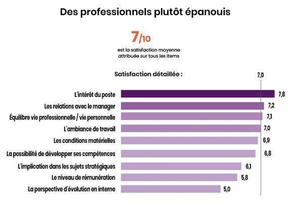 Finissons sur ce constat qui inspire un enthousiasme relatif : le ou la professionnelle QSE est un ou une professionnelle plutôt épanouie. Le score de satisfaction sur le poste s’établit en moyenne à 7 sur 10 (contre 6,4 en 2018), les quatre premiers critères de satisfaction cités étant l’intérêt du poste, l’ambiance de travail, l’équilibre entre vie professionnelle et vie personnelle, les relations avec le manager. Nous avons accolé l’adjectif « relatif » au mot « enthousiasme » car nous observons une petite alerte sur les perspectives d’évolution en interne, critère qui ne récolte qu’un score de 5 sur 10. Or, 47 % des professionnels se voient à un autre poste dans trois ans, idéalement à un niveau de poste supérieur (26 %). Cela génère une légère frustration qui se reflète dans les réponses à la question des situations redoutées : un professionnel sur deux dit qu’il craint de rester au salaire actuel. Cette réponse est citée en premier par un quart de l’échantillon. Quête d’une progression hiérarchique, quête de sens, équilibre de vie, reconversion… En filigrane, nous avons affaire à une fonction encore à la recherche de reconnaissance et de projection, conclut Anne-Laure Mauduit-Devillers.