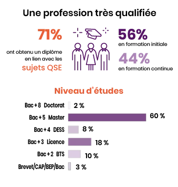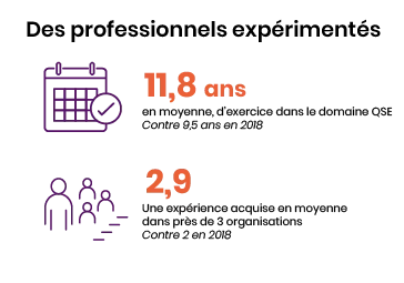 Hommes et femmes de cet univers sont tous diplômés, majoritairement de filières QSE en formation initiale à l’université menant à un niveau bac + 5. Le diplôme QSE semble structurer des trajectoires plus spécialisées, orientées vers les fonctions cœur du métier, les référentiels normatifs et l’évolution professionnelle, commente Anne-Laure Mauduit-Devillers, consultante spécialiste du domaine, partenaire d’AFNOR Parcours Croisés pour cette étude. Une fois en poste, les responsables QSE y restent, et de plus en plus longtemps : ils affichent près de douze ans d’ancienneté au compteur, contre neuf ans et demi en 2018. Cette expérience est exercée dans trois organisations en moyenne (2,9 exactement). Comme ce chiffre de la mobilité était de deux il y a sept ans, on peut y voir un effet du relatif vieillissement de cette population.
