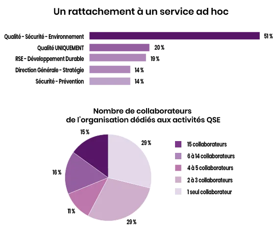 L’étude montre aussi que la fonction QSE est une fonction bien installée dans l’entreprise : 94 % des professionnels sont en CDI, avec un titre qui est celui de « responsable » à 58 %. Viennent ensuite les titres d’« ingénieur », de « coordinateur » et de « directeur » (au masculin comme au féminin, bien sûr). Le statut cadre est dominant : 69 %. Un sur trois siège au comité de direction : 30 % exactement. Avec quel périmètre ? « QSE » à 41 %, « qualité » seule à 28 %, « HSE » à 6 %, le H désignant « hygiène ». La fonction QSE combinée connaît une progression significative, avec des professionnels qui assument davantage de responsabilités et élargissent l’étendue de leurs missions , commente Anne-Laure Mauduit-Devillers, en constatant qu’au lieu des 41 % de QSE de 2025, ils étaient 33 % en 2018. Subtilité : le périmètre d’exercice ne coïncide pas forcément avec le département de rattachement, puisqu’en face des 41 % exerçant sur un périmètre dit QSE, avec des sujets qualité, sécurité et environnement, 57 % le font depuis une case de l’organigramme qui porte vraiment l’intitulé QSE. Ce département ou service de rattachement est intitulé « qualité » dans 20 % des cas, « RSE » dans 19 % des cas, et c’est carrément la direction générale dans 14 % des cas. Ce service compte le plus souvent un seul (29 % des cas) ou bien deux à trois (29 % des cas aussi) collaborateurs. Evidemment, plus la taille de l’entreprise est grande, plus l’effectif QSE est nombreux : 93 collaborateurs sur les sujets QSE dans les grands groupes !